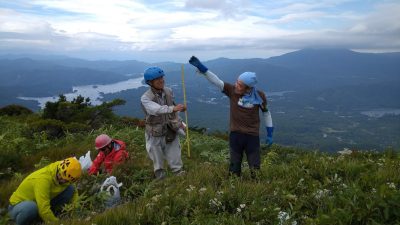 赤埴林道からスタートし、噴火壁を下山し裏磐梯登山口駐車場に出るルートで侵略的外来種コウリンタンポポの調査と防除活動を行いました。