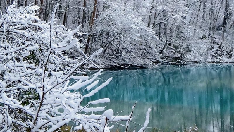 初雪が裏磐梯の森を静かに包み込み、湖沼は澄んだ青をたたえて冬の訪れを映し出しています。