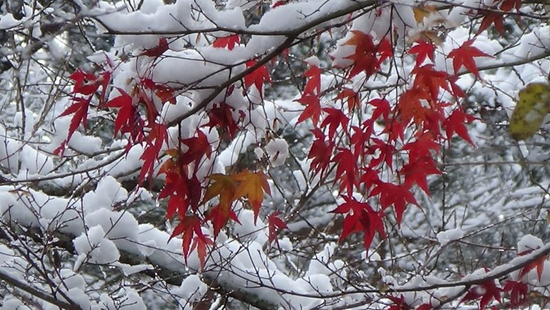紅葉の名残にそっと雪が降り積もり、秋と冬が出会う一瞬だけの幻想的な世界。