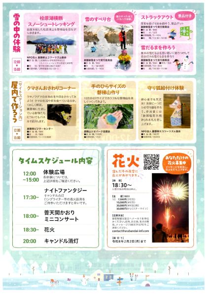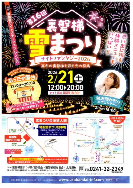 2026-01-27 / 最終更新日時 : 2026-01-27 admin 未分類 第16回 裏磐梯雪まつり2026年2月21日(土) 12:00~20:00 裏磐梯サイトステーションタイムスケジュール 12:00~15:00 体験広場17:30~ ナイトファンタジー18:00~ 普天間かおりミニコンサート18:30~ 花火20:00 キャンドル消灯